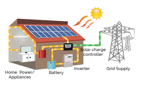 Off-grid systems work independently of the grid but have batteries which can store the solar power generated by the system. The system usually consists of solar panels, battery, charge controller, grid box, inverter, mounting structure and balance of systems.